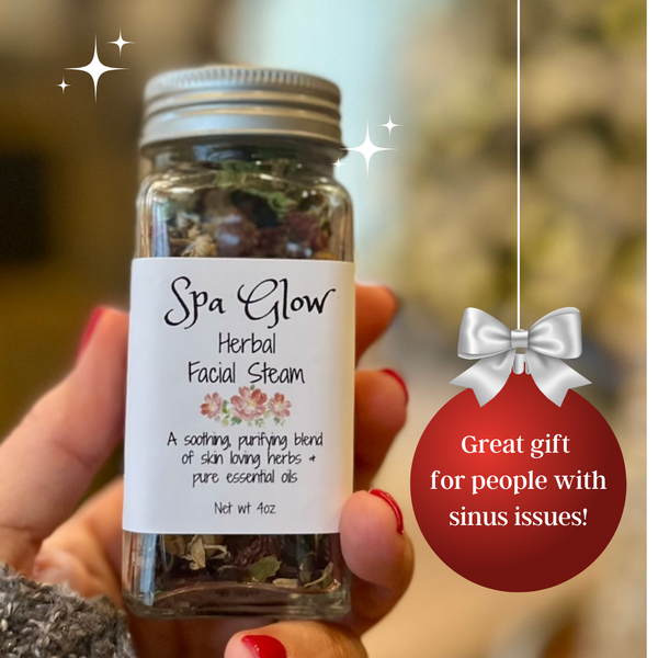 The Spa Glow Herbal Facial Steam is a luxurious blend of organic, skin-loving herbs, perfect for the cold, dry winter months. Think of it as a nourishing herbal tea for your skin. The jar contains instructions for use, but it's as easy as steeping a small amount of "tea" in a large bowl, then placing your head over the bowl to expose your face to the botanically infused steam. This is not only a wonderfully cleansing, purifying treatment for your pores, but the eucalyptus & spearmint are also therapeutic decongestants, great for stuffy sinuses! The 4 ounce glass jar contains enough herbs for several treatments.